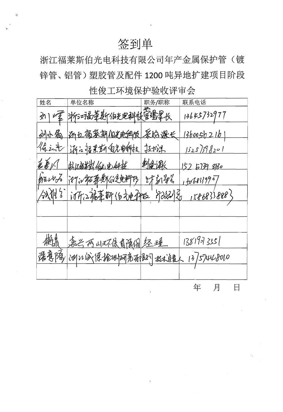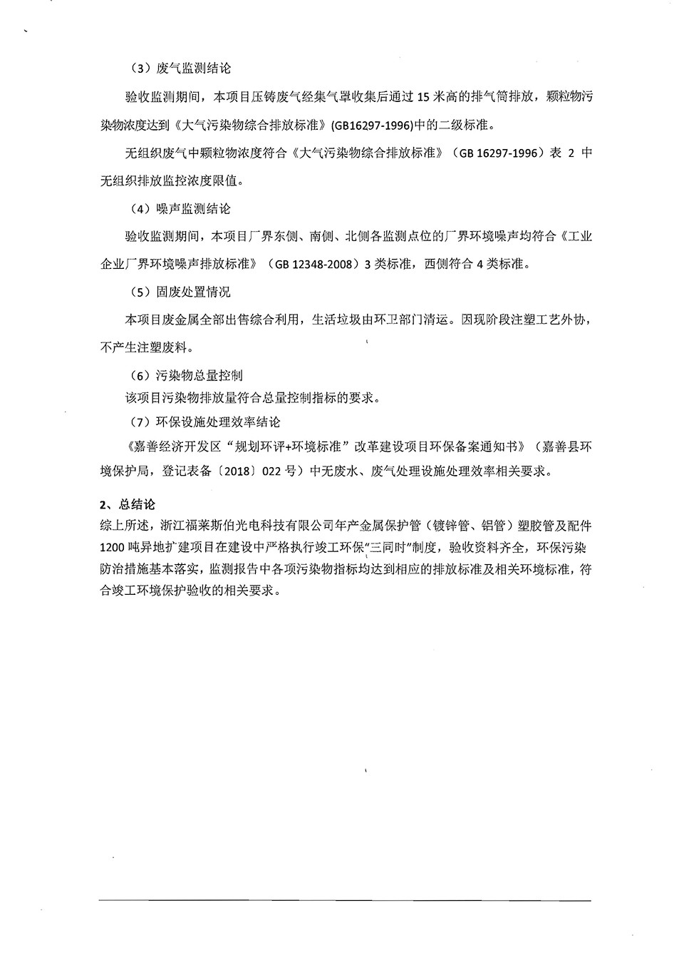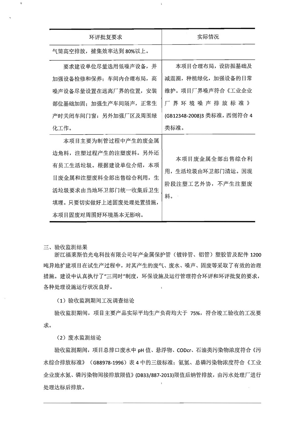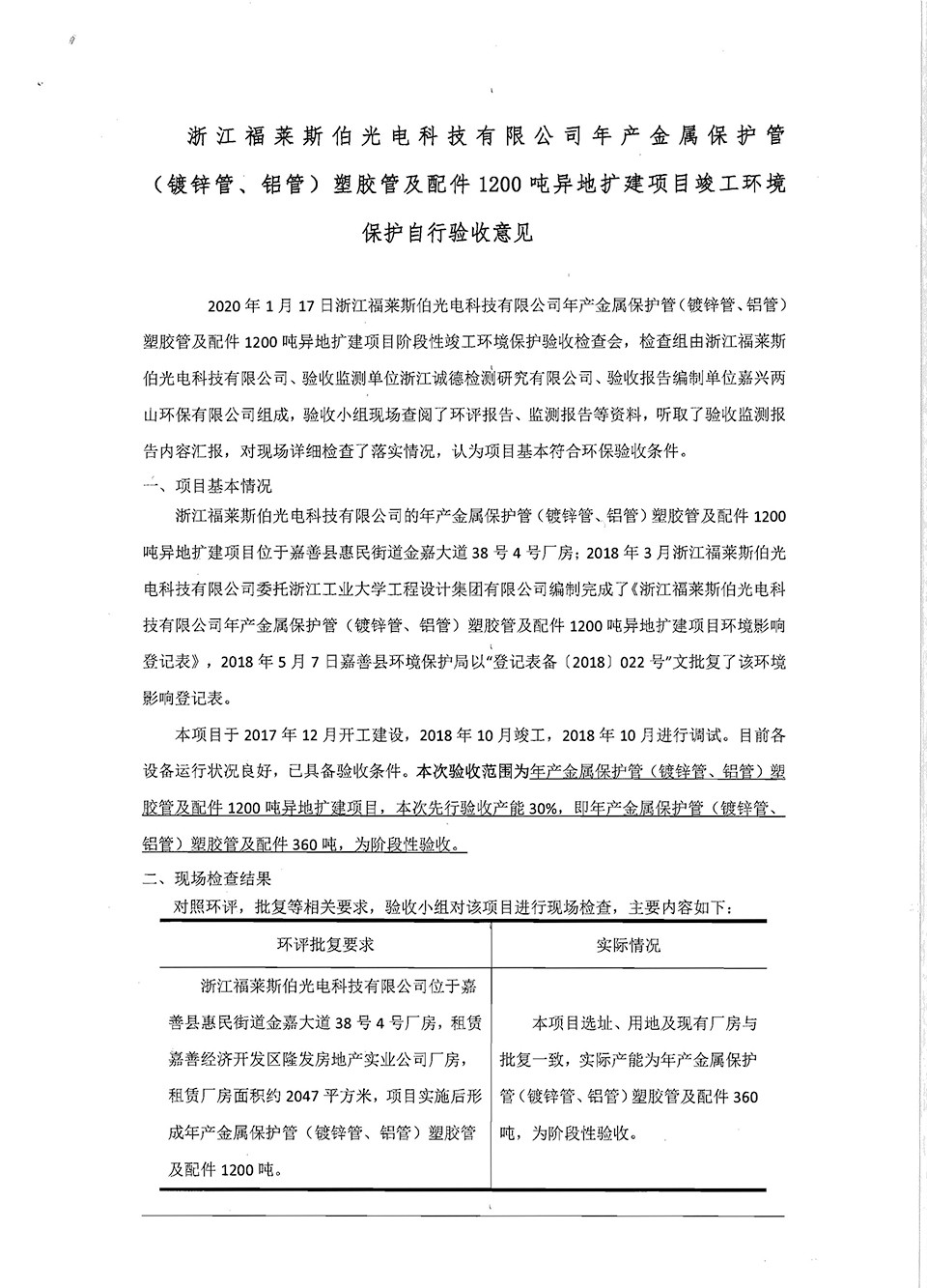 浙江福萊斯伯年產(chǎn)金屬保護管(鍍鋅管,鋁管)塑膠管及配件1200噸異地擴建項目竣工環(huán)境保護自行驗收意見